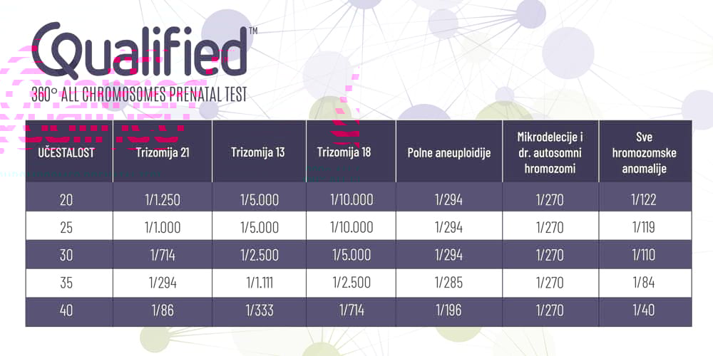 Qualified™ 360° je all-chromosomes & microdeletions ∕ duplications prenatalni test koji Vam pruža informacije o trizomijama i monozomijama za sve hromozome dajući Vam širi uvid od standardnih prenatalnih testova. Rijetke autozomne trizomije i monozomije mogu da se jave posebno uz anomalije vidljive na ultrazvučnom pregledu. Preporuka je da se u tim slučajevima uradi invazivna procedura.