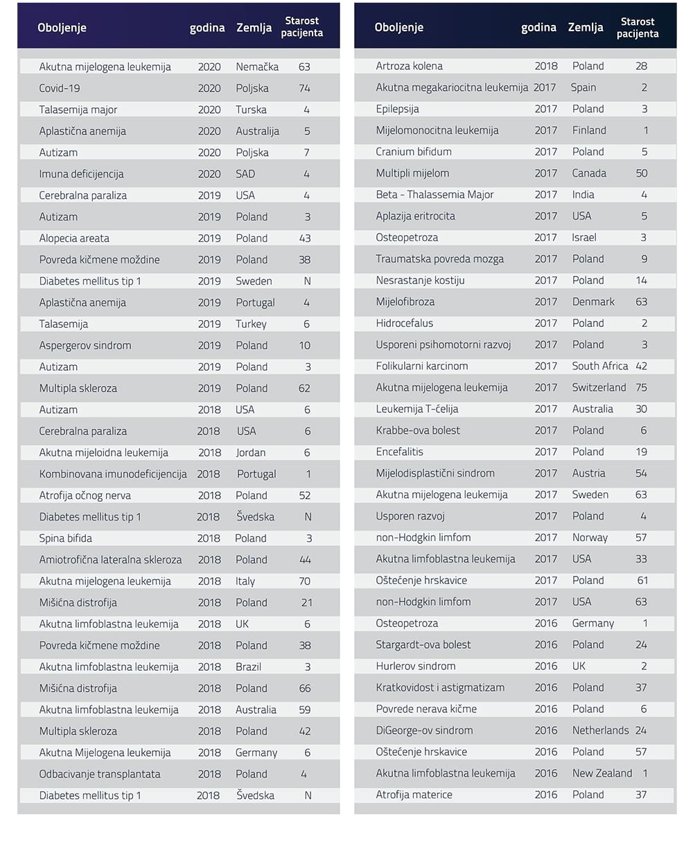 Lista bolesti tretiranih matičnim ćelijama